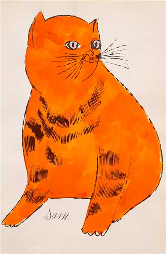 Kolejnym artystą miłośnikiem kotów był Andy Warhol. Zazwyczaj nie zwraca się uwagi na jego prace poświęcone tym czworonogom, ponieważ większość ludzi skupia się przede wszystkim na malowanych przez niego portretach gwiazd. A jednak! Jego zamiłowanie do kotów przełożyło się na jego twórczość i w 1954 wydał album o nazwie „25 Cats Name Sam and One Blue Pussy” (Warhol postanowił nie poprawiać błędu w słowie „name”, któremu oczywiście brakuje „d”, ponieważ lubił tego typu „skazy”). Sprzecznie z nazwą, album zawiera rysunki przedstawiające 16 kotów o imieniu Sam oraz jedną niebieską kotkę. Wszystkie litografie były ręcznie kolorowane przez artystę. Album został wydrukowany prywatnie, najprawdopodobniej w nakładzie poniżej 150 kopii. Innym albumem zawierającym prace Warhola przedstawiające koty jest „Holy cats- illustrations”.