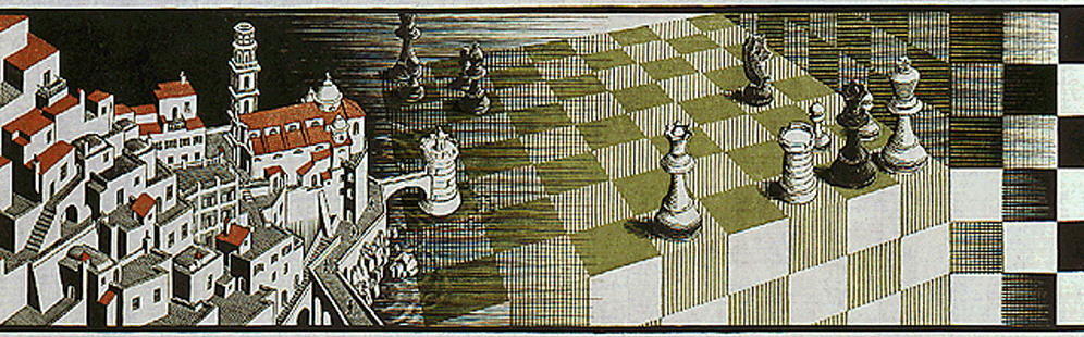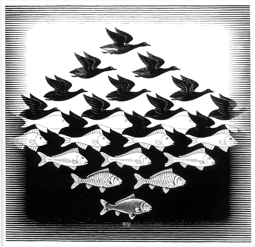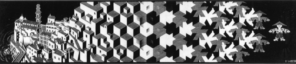 Jednak malarzem, na którego twórczości chcę się dzisiaj skoncentrować jest Maurits Cornelis Escher (1898-1972). Jest to twórca, którego trudno „zaklasyfikować” do jednego nurtu malarstwa. Niektórzy twierdzą, że reprezentuje op-art, jednakże trudno całkowicie zgodzić się z tym twierdzeniem. Część jego prac faktycznie można zakwalifikować do tego nurtu, jednakże inne są raczej swoistymi zagadkami logicznymi (np. różnego rodzaju „niemożliwe” figury geometryczne). Do technik, którymi się posługiwał należą przede wszystkim drzeworyt, linoryt i rysunek.