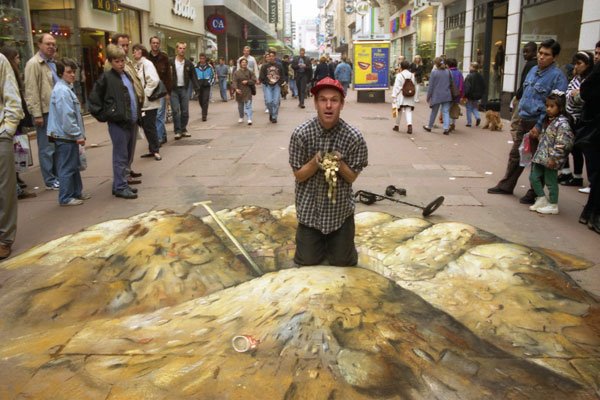 A jak zastosowanie trompe l’oeil wygląda dzisiaj? Jak się okazuje wciąż znajduje kontynuatorów. Jednym z nich jest Brytyjczyk Julian Beever, który ze swoją twórczością wyszedł na ulice. Zajmuje się bowiem street artem- a dokładniej jego „trójwymiarową” odmianą. Namalowane przez niego obrazy sprawiają wrażenie trójwymiarowości: