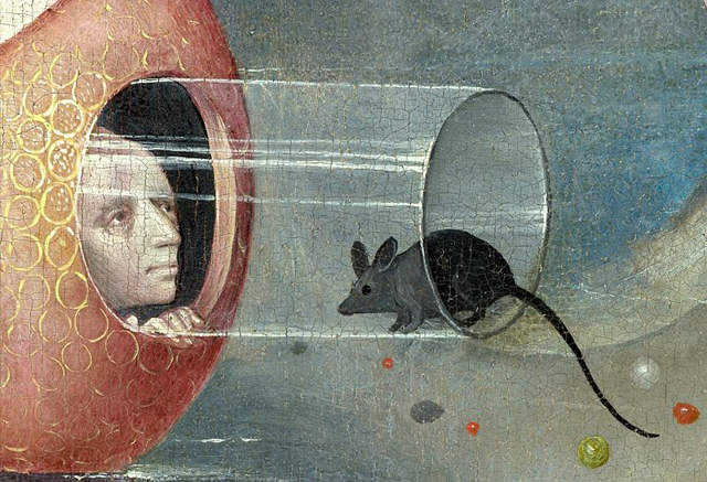 Pierwszą pracą, która przedstawia zarówno mysz, jak i królika jest Ogród Ziemskich Rozkoszy- tryptyk Hieronima Boscha, którego stworzenie zajęło mu aż 10 lat (1480-1490). Uważa się, ze ten niderlandzki malarz był inspiracją dla XX-wiecznych surrealistów. To monumentalne dzieło (2,2 m x 3,89 m) przedstawia Raj, upadek ludzkości i Piekło. Według słownika symboli Władysława Kopalińskigo mysz symbolizuje m.in dzień i noc, tajemniczość, zagrażające zło, podstęp, chciwość, plagę, wojnę, śmierć, plagę.