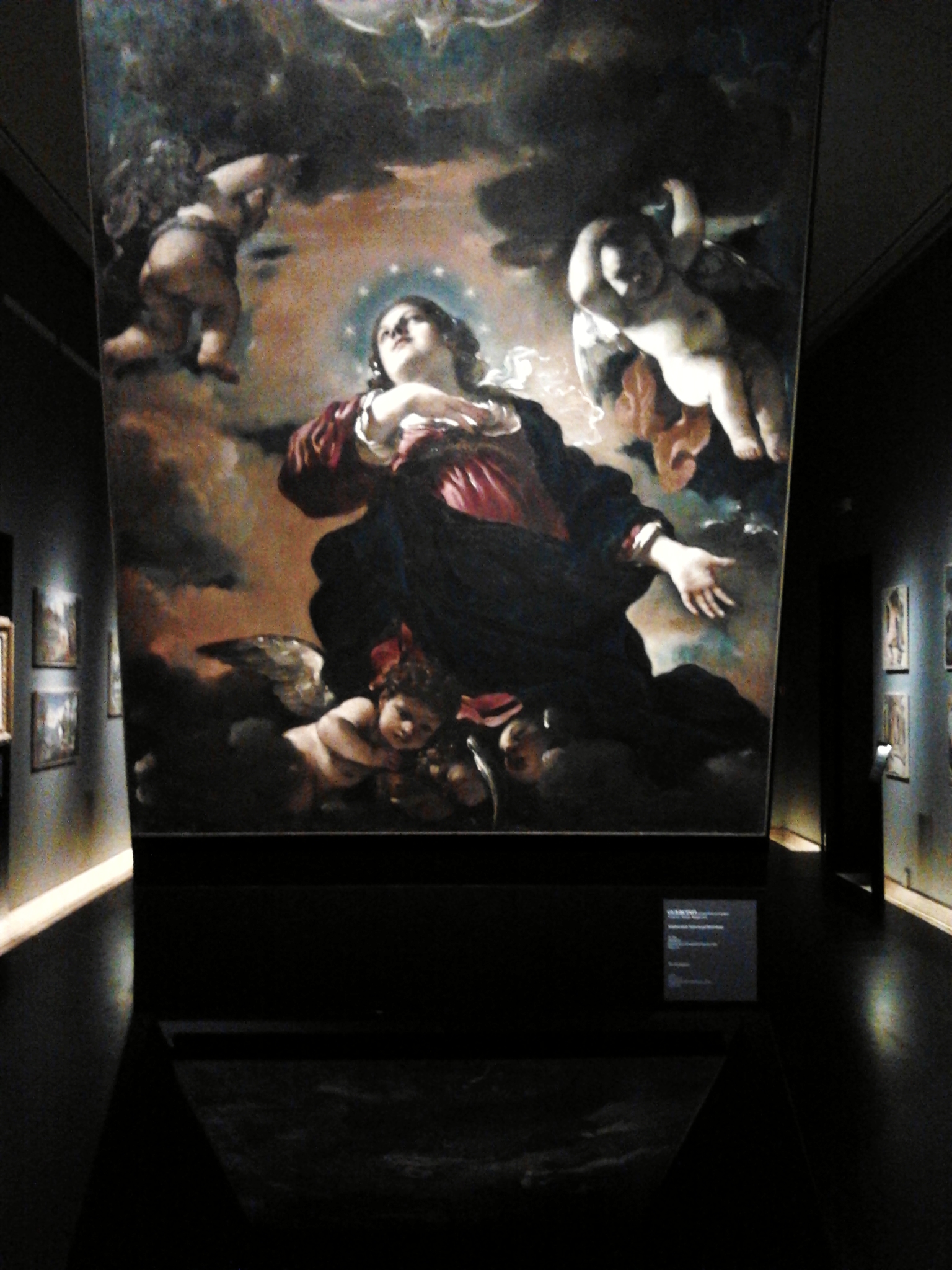 Guercino w swoich obrazach porusza przede wszystkim tematykę religijną. Jego obrazy epatują patosem oraz wyróżniają się zdecydowanymi kontrastami świetlnymi. Tę grę świateł dało się zauważyć od razu po wejściu do kolejnej sali wystawy, w której zostały umieszczone płótna przedstawiające sceny z życia św. Karola Boromeusza. Jednak obrazem, który zrobił na mnie największe wrażenie było znajdujące się nieco dalej „Wniebowzięcie Najświętszej Marii Panny” (1622 r.). Płótno to zostało ustawione ukośnie w stosunku do płaszczyzny podłogi, a pod nim umieszczono ciemne lustro, które pod kątem odbijało obraz, tworząc interesujące wrażenie przedłużenia płótna i pewną dezorientację poprzez złamanie perspektywy. Interesujące było- wciąż nowatorskie jak na tamte czasy- zastosowanie bardzo wyraźnego skrótu perspektywicznego, w taki sposób, że widziane na obrazie postaci (Maria oraz putta) ukazane są od dołu- tak, że osoba patrząca na obraz ma wrażenie, iż postaci faktycznie wznoszą się ku niebu.