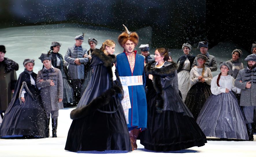 Od razu spodobała mi się scenografia (Magdalena Maciejewska) i kostiumy (Dorota Roquelpo), utrzymane w prostej tonacji kolorystycznej (czerń, biel, szarość, brąz). Mogłam odetchnąć z ulgą, ponieważ zobaczyłam, że spektakl (najprawdopodobniej) nie będzie na siłę udziwniany/ unowocześniany, czego w spektaklach operowych po prostu nie trawię, tym bardziej jeśli dotyczy to dzieł, do których żywię szczególny sentyment (wprawdzie czas akcji przeniesiono z XVIII wieku do czasów po powstaniu styczniowym, ale w żaden sposób nie zakłócało to odbioru). Co ciekawe, po raz pierwszy byłam świadkiem wyraźnego pomruku zadowolenia publiczności, w reakcji na podniesienie kurtyny – miało to miejsce w momencie odsłonięcia scenografii czwartego aktu, czyli pięknej, śnieżnej scenerii, która została od razu nagrodzona gromkimi brawami. Ciekawym zabiegiem było odcięcie od tego śnieżnobiałego tła zespołu baletowego, który został ubrany w kolorowe stroje (czerwony, żółty, niebieski).