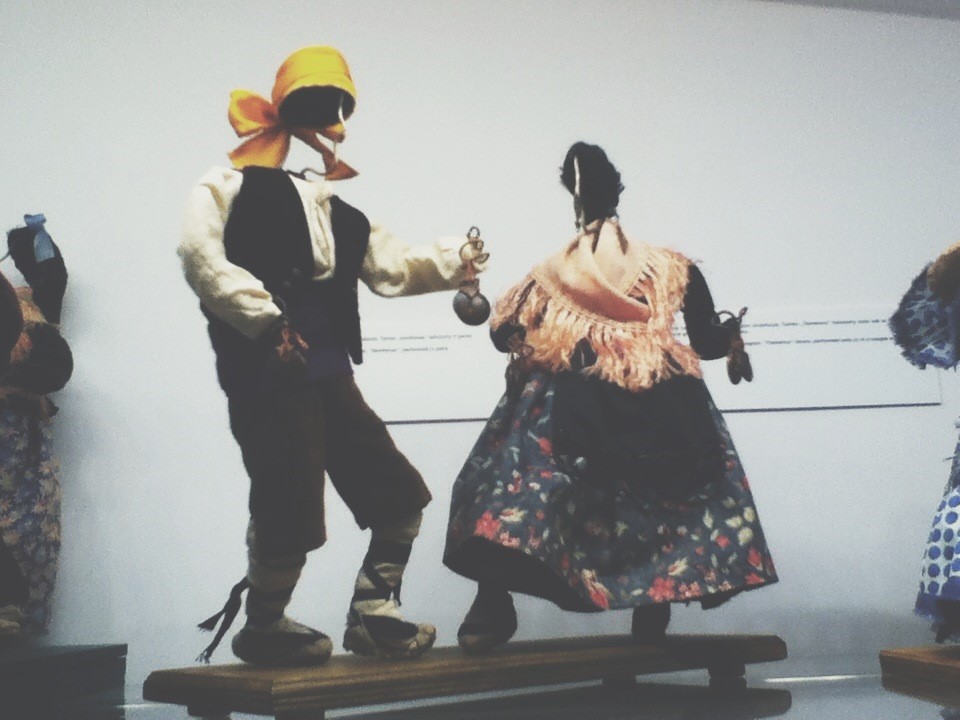 Następna sala mieściła kolekcję makiet tańców ludowych, będąca częścią wystawy „Czas świętowania”, nad którą zespół muzealny pod przewodnictwem dyrektora Adama Czyżewskiego pracował przez trzy lata. Mimo, że ta część akurat nie za bardzo przypadła mi do gustu, ponieważ temat tańca najzwyczajniej w świecie nie trafia w moje zainteresowania, to uważam, że sam pomysł jest całkiem udany. W kolejnych gablotach można oglądać niewielkie kukiełki ustawione w pozach charakterystycznych dla tańców z danych regionów, ubrane w stroje wzorowane na strojach ludowych. I tak zwiedzający mogą obejrzeć zamknięte za szybami figurki przedstawiające polskich, litewskich, estońskich czy katalońskich tancerzy. Nie ograniczono się jednak tylko do zwyczajnych strojów- jedna z gablot zawierała miniaturowe postaci ubrane w stroje i maski karnawałowe. Co ciekawe, przedstawiona kolekcja, mimo, że wygląda bardzo współcześnie (osobiście myślałam, że powstała w czasie ostatniego dziesięciolecia), została stworzona w 1937 roku! Przez ponad 70 lat spoczywała w zapomnieniu na poddaszu biblioteki Opery Paryskiej, aby w 1991 roku znaleźć się w zbiorach Państwowego Muzeum Etnograficznego w Warszawie.[6]