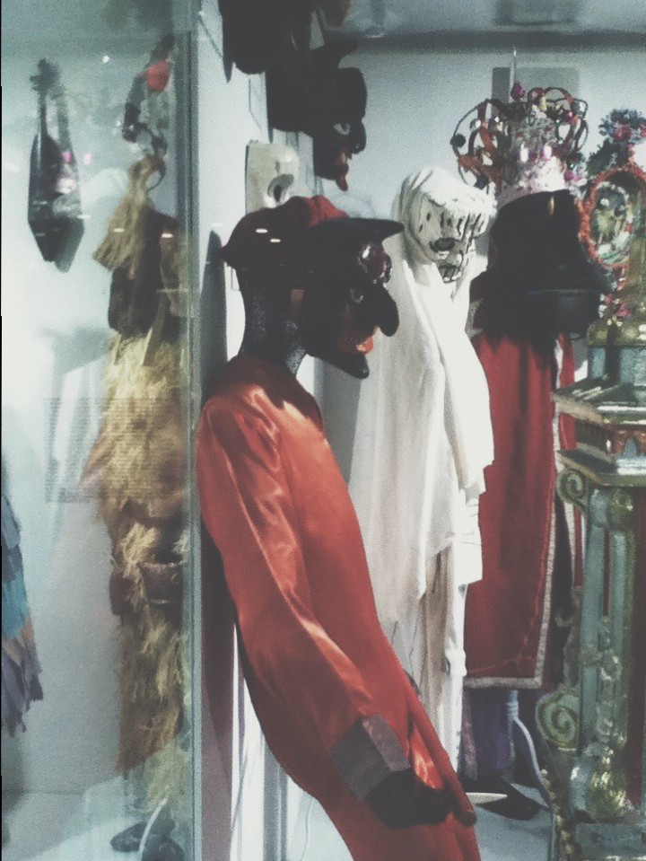 Kolejna część wystawy „Czas świętowania” zajmuje aż dwa piętra- w sumie 1100 metrów kwadratowych i liczy 1,5 tysiąca eksponatów. To tam „dopadł” mnie przemiły ochroniarz, który wcielił się na chwilę w rolę przewodnika i oprowadził po części poświęconej częściom dekoracyjnym polskich strojów ludowych (ciekawostka- hafty były wyszywane przez mężczyzn, ponieważ dzierganie w owczej skórze wymagało całkiem sporej siły fizycznej!). Tych kilka sal zawierało olbrzymią kolekcję strojów ludowych (polskich i europejskich), uporządkowanych chronologicznie według czasu powstania oraz szereg ozdobnych akcesoriów, ubrań związanych z obchodami świąt, masek, instrumentów muzycznych, dziecięcych zabawek i tak dalej. Słowem- znajdowało się tam wszystko to, co może kojarzyć się z różnego rodzaju obyczajami i obrzędami. Nie zabrakło także wyświetlanych na ekranach krótkich form audiowizualnych. Ponadto przy wejściu do tej sali zainstalowano 2 pojemniki, z których ulatniała się para wodna. Zaintrygowana podeszłam bliżej i przeczytałam, że „Czas świętowania” jest pierwszą w naszym kraju ekspozycją, której towarzyszy „ilustracja zapachowa”. Ze wspomnianych pojemników (a właściwie- jak się dowiedziałam- z aroma dyfuzorów) wydobywa się kompozycja zapachowa, która ma przywoływać na myśl zapach świąt! Pomysł niezwykle ciekawy, chociaż żadnego zapachu nie poczułam.