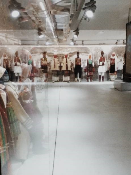 Parę obiektów w tej części wystawy skłoniło mnie do przemyśleń. Przede wszystkim były to całkiem współczesne, bo pochodzące z lat dwutysięcznych, obiekty zamknięte w szklanych gablotach. Były to różnego rodzaju zabawki i kiczowate, plastikowe ozdoby, które można kupić na odpustach. W pierwszych gablotach tej sali znajdowały się oczywiście starsze wytwory tego typu, to znaczy wytworzone z tych samych pobudek, z tej samej okazji. Ciekawe, że mimo zmiany materiałów, z jakich były zrobione te przedmioty, to tradycja pozostaje ta sama. Najpierw zwiedzający zapewne patrzą z przymrużonym okiem na przedmioty wyprodukowane przed laty, aż tu nagle orientują się, że w gruncie rzeczy nic się nie zmieniło, a kolejne pokolenia będą oglądać naszą codzienność zaklętą pod postacią materialną i patrzeć na nią jako na relikt przeszłości. Kolejna rzecz, która wzbudziła moje zainteresowanie, to znajdująca się na pierwszym piętrze kolekcja strojów polskich, w zestawieniu ze strojami z innych państw europejskich. Mając przed oczami tę różnorodność wzorów i kolorów, w pewnym momencie zauważamy, że te „wzory i kolory” w poszczególnych europejskich obszarach tak bardzo się od siebie nie różnią. Szczególnie mam na myśli obszary bliskie sobie geograficznie. I tak, polskie stroje były całkiem podobne do łotewskich, a zupełnie inne- zarówno w kroju jak i zastosowanej kolorystyce i wzorach- od tych pochodzących z zachodu Europy. Dzięki temu możemy uświadomić sobie jak jedne ośrodki kultury mogą wywierać wpływ na inne i że w gruncie rzeczy- choć zdaję sobie sprawę, że zabrzmi to banalnie- jesteśmy jedną wielką rodziną, o podobnych korzeniach, zwyczajach, tradycjach.
